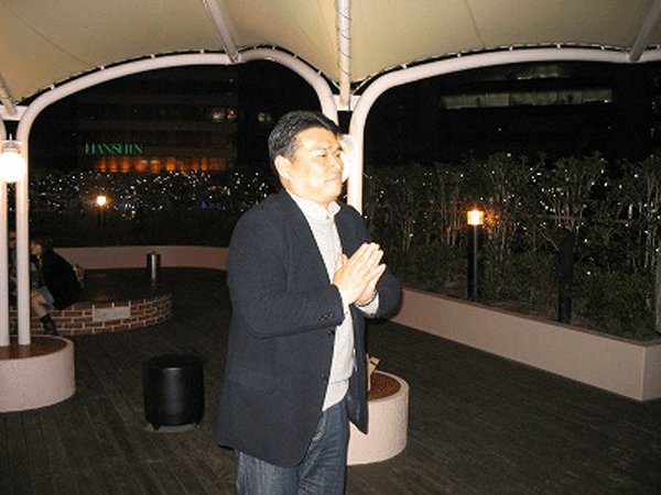 その店先・梅田の高層ビル街マルビル3階で‥、夜これからの21時、おおきく息を吸い込むダイマツの姿とおもむろに肩を組みエンジンいや猿人、失礼(笑)!円陣をつくるオッサンの集団あり!